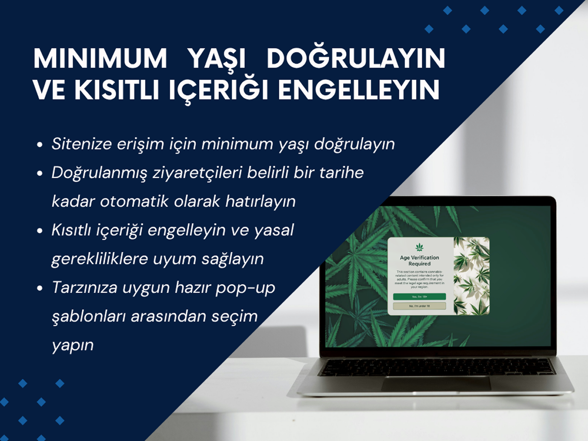 Web sitenizde yaşa duyarlı içeriklere erişimi sezgisel bir yaş doğrulama popup'ı ile kontrol edin. 18+, 21+ veya ihtiyacınıza uygun yaş sınırını belirleyerek yasal gerekliliklere kolayca uyum sağlayın. Tarzınıza uygun hazır şablonlar arasından seçim yapın ve logonuzu ekleyerek markanıza özel hale getirin.