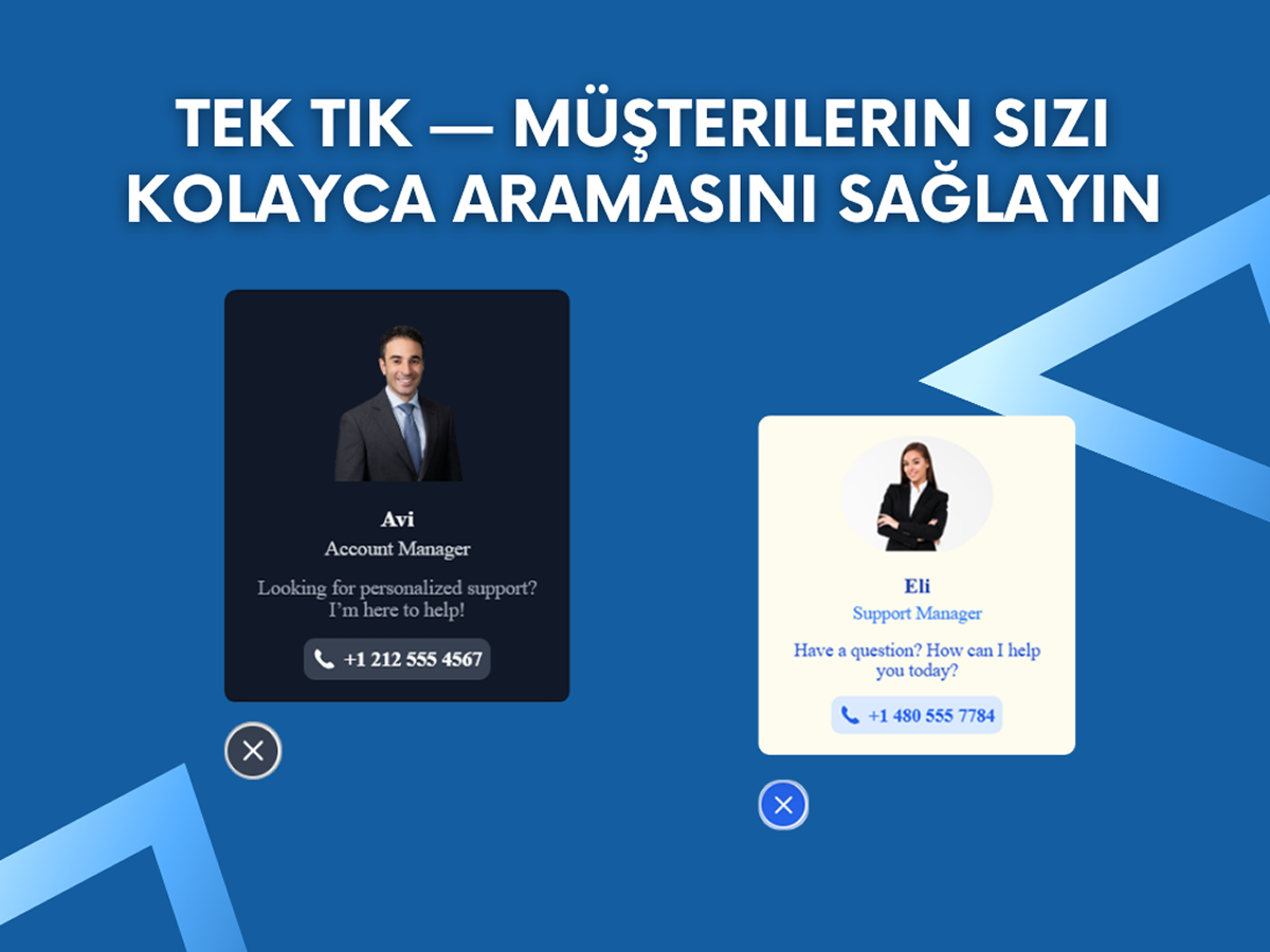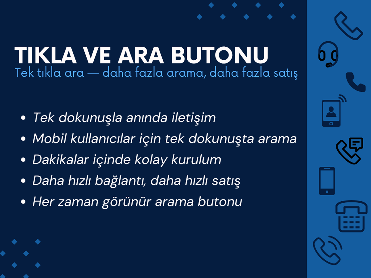 Tıkla ve Ara Butonu, tamamen özelleştirilebilir kayan bir buton ile müşterilerin size kolayca ulaşmasını sağlar. Kişisel mesajlar ve iletişim bilgileri ekleyerek daha samimi bir deneyim sunun.