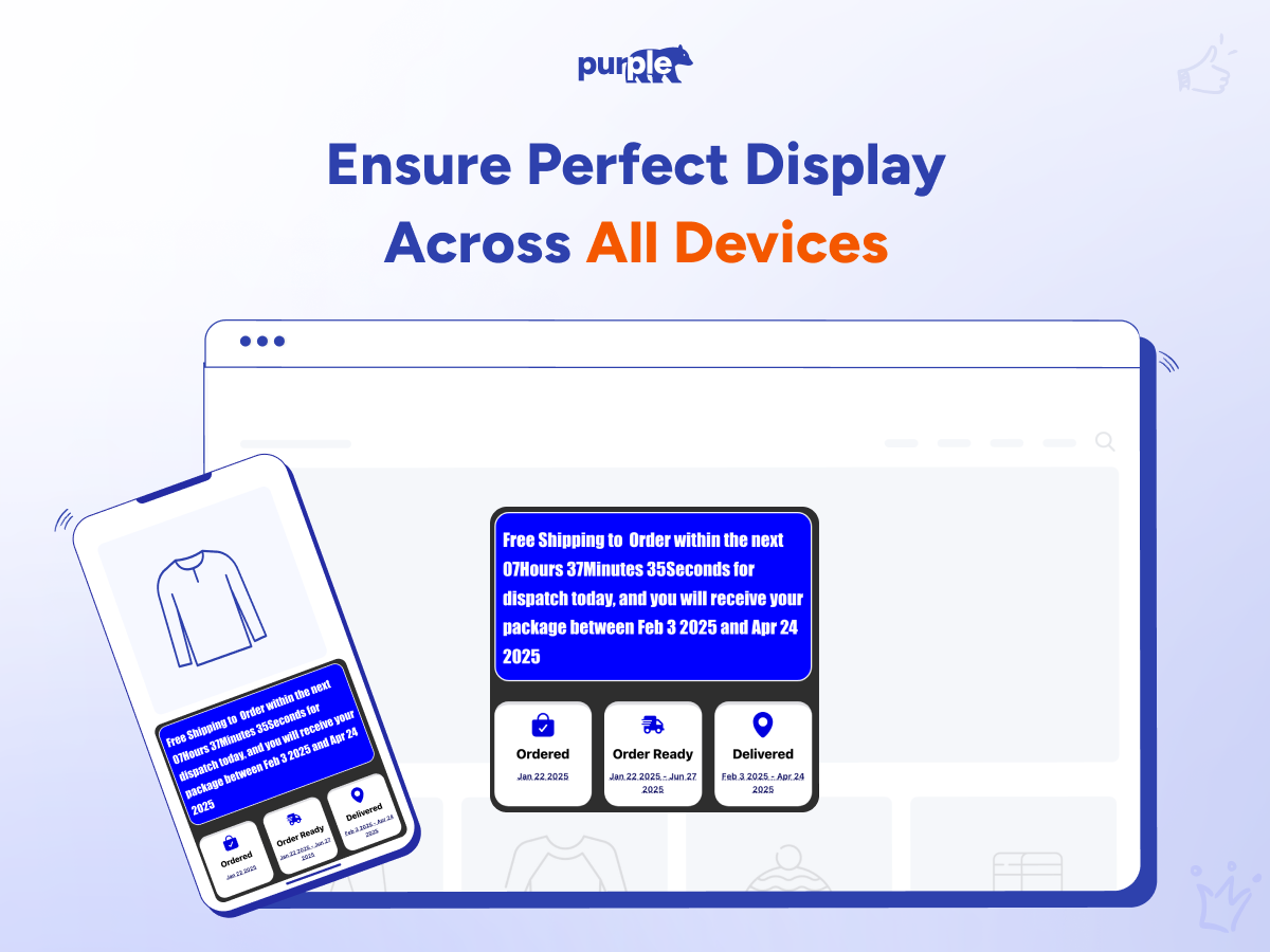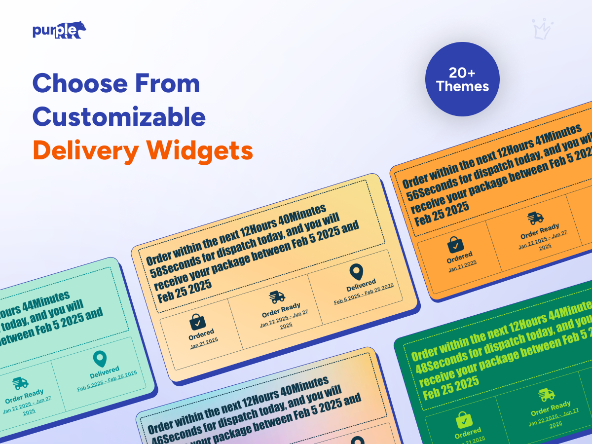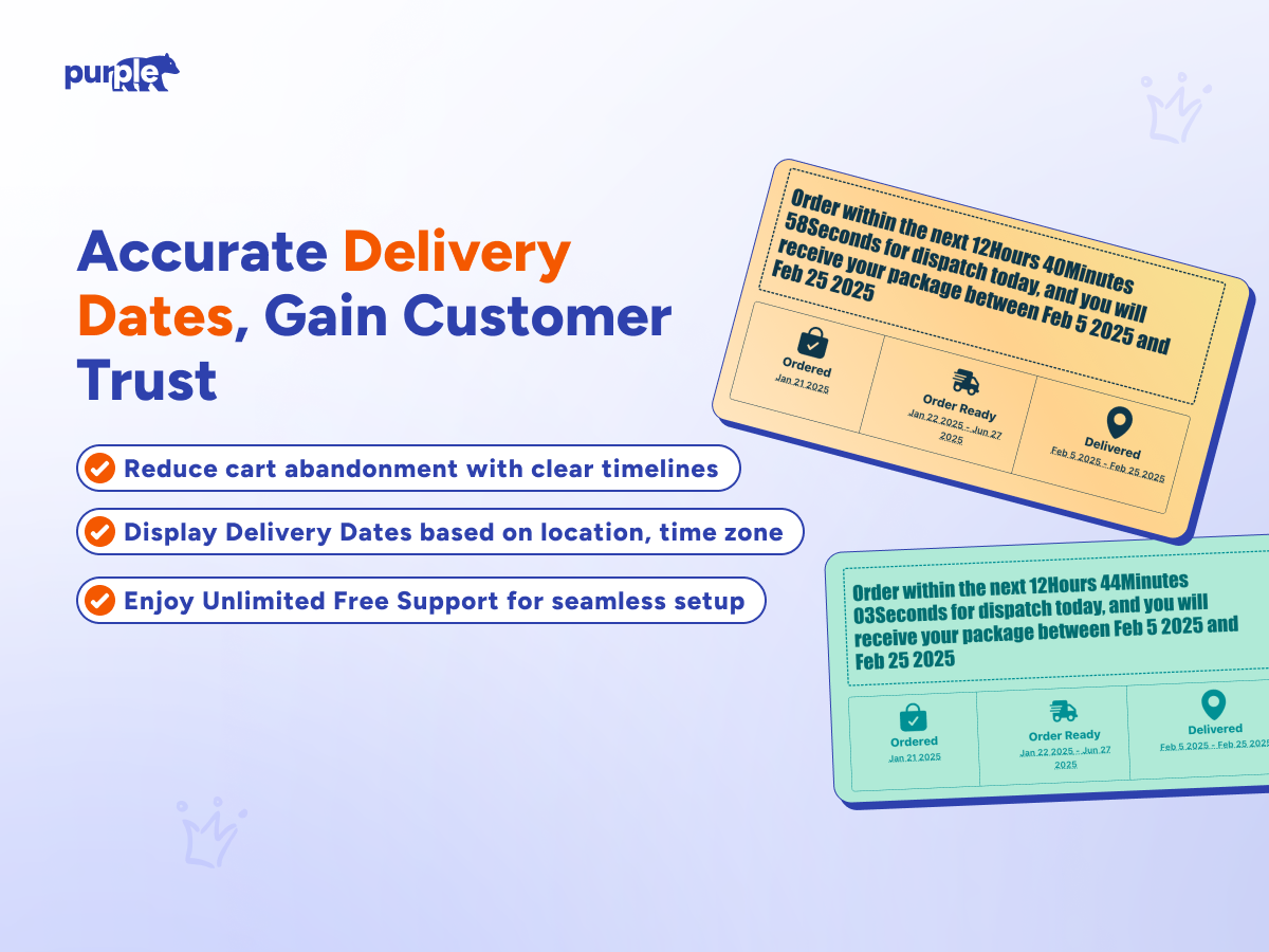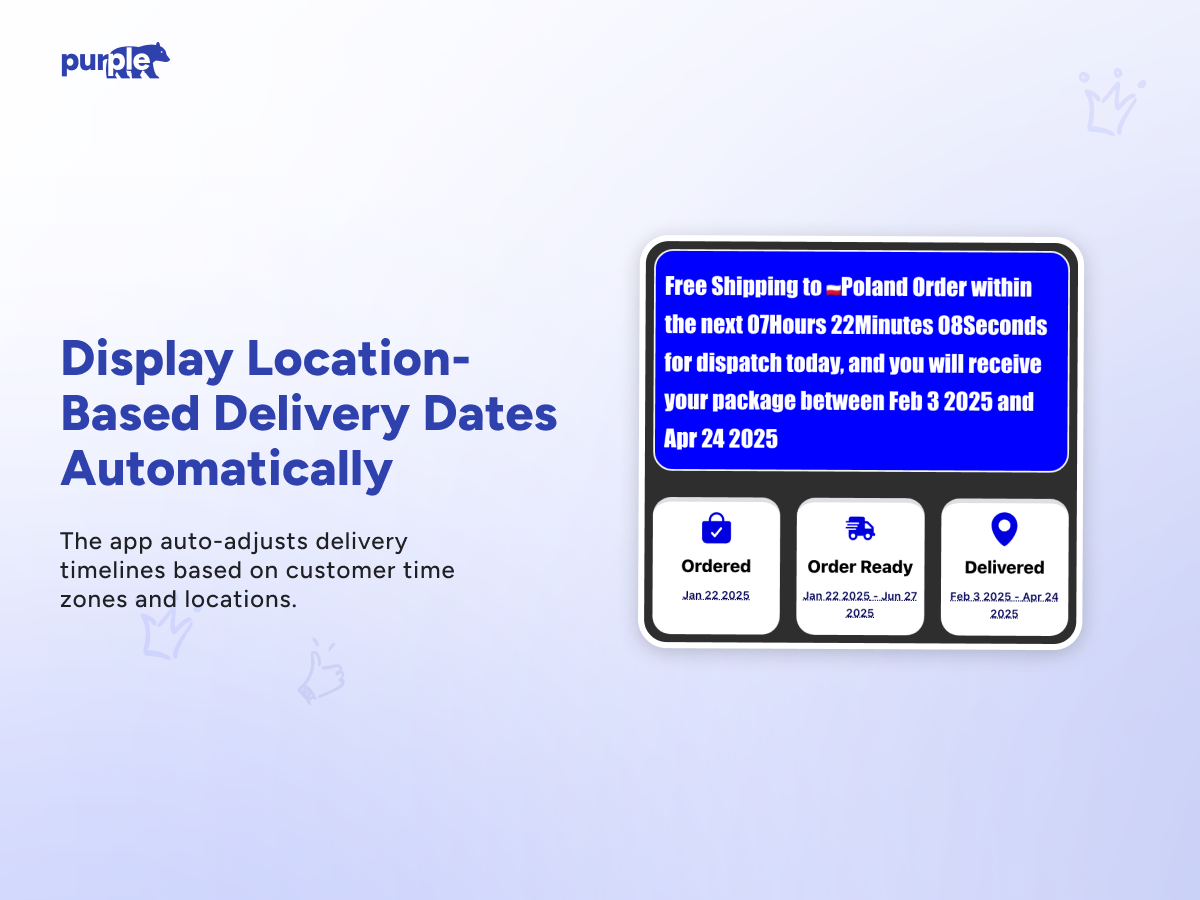 Müşterilerinizi kesin teslim tarihleriyle bilgilendirerek alışveriş deneyimlerini geliştirin ve sepet terkini azaltın. Uygulamamızla, ürün, sepet ve ödeme sayfalarına kolayca özelleştirilebilir teslimat süresi widget'ları ekleyebilir, müşteri konumuna ve saat dilimine göre doğru tahmini teslim tarihlerini görüntüleyebilirsiniz. Ürünlere, koleksiyonlara, çalışma günlerine, tatillere ve tarih biçimlerine yönelik teslim ayarlarını kolayca yapılandırın.