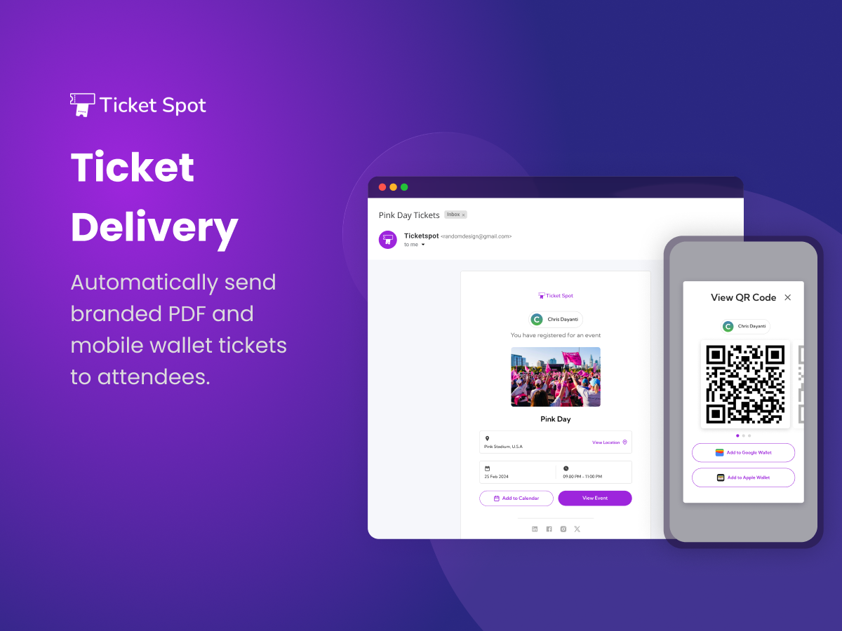 Give attendees a smooth checkout experience and automatically deliver branded digital tickets via email, including PDF tickets, Apple Wallet passes, and calendar integrations.
