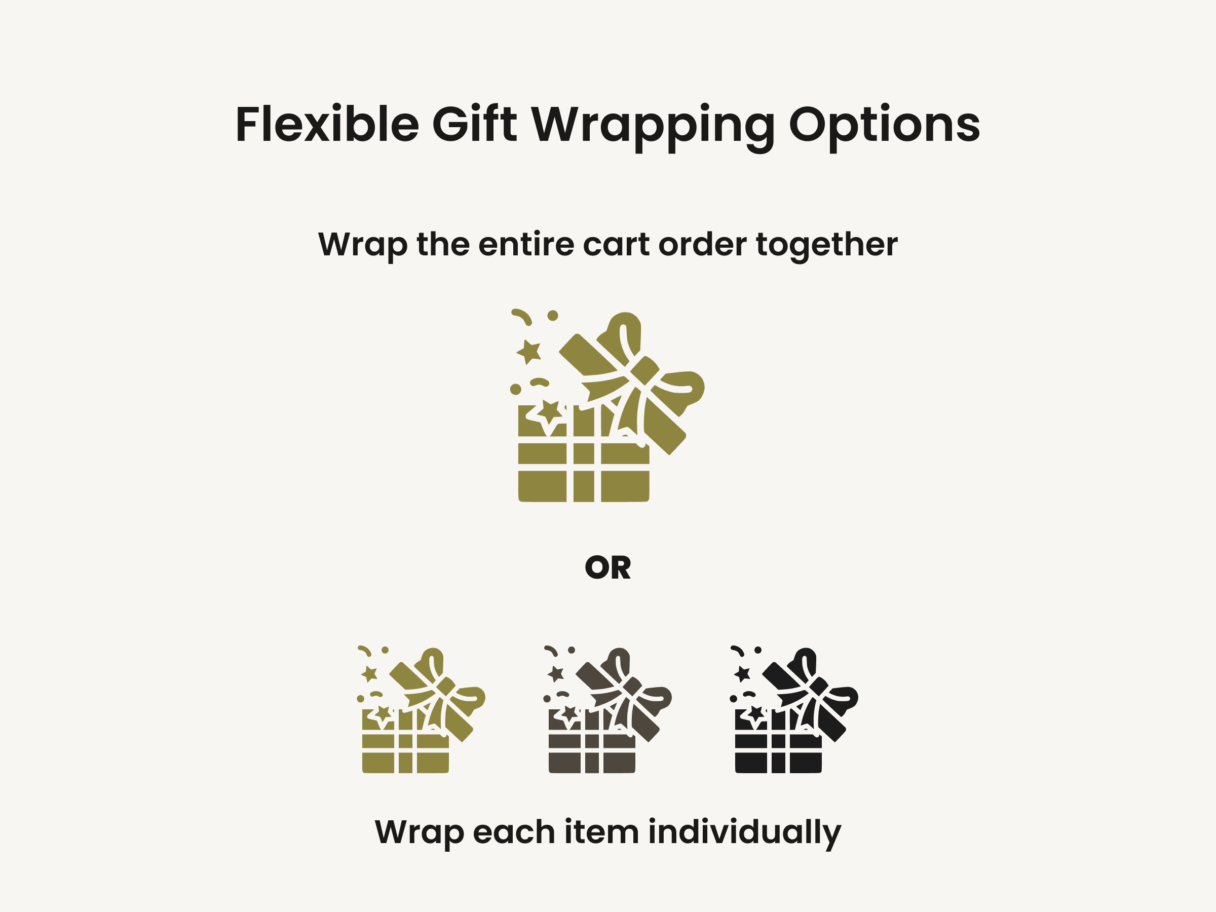Your customers can choose to wrap the entire cart for one fee or wrap each individual item in the cart, with the price multiplying automatically based on their wrap selection and what's in their cart