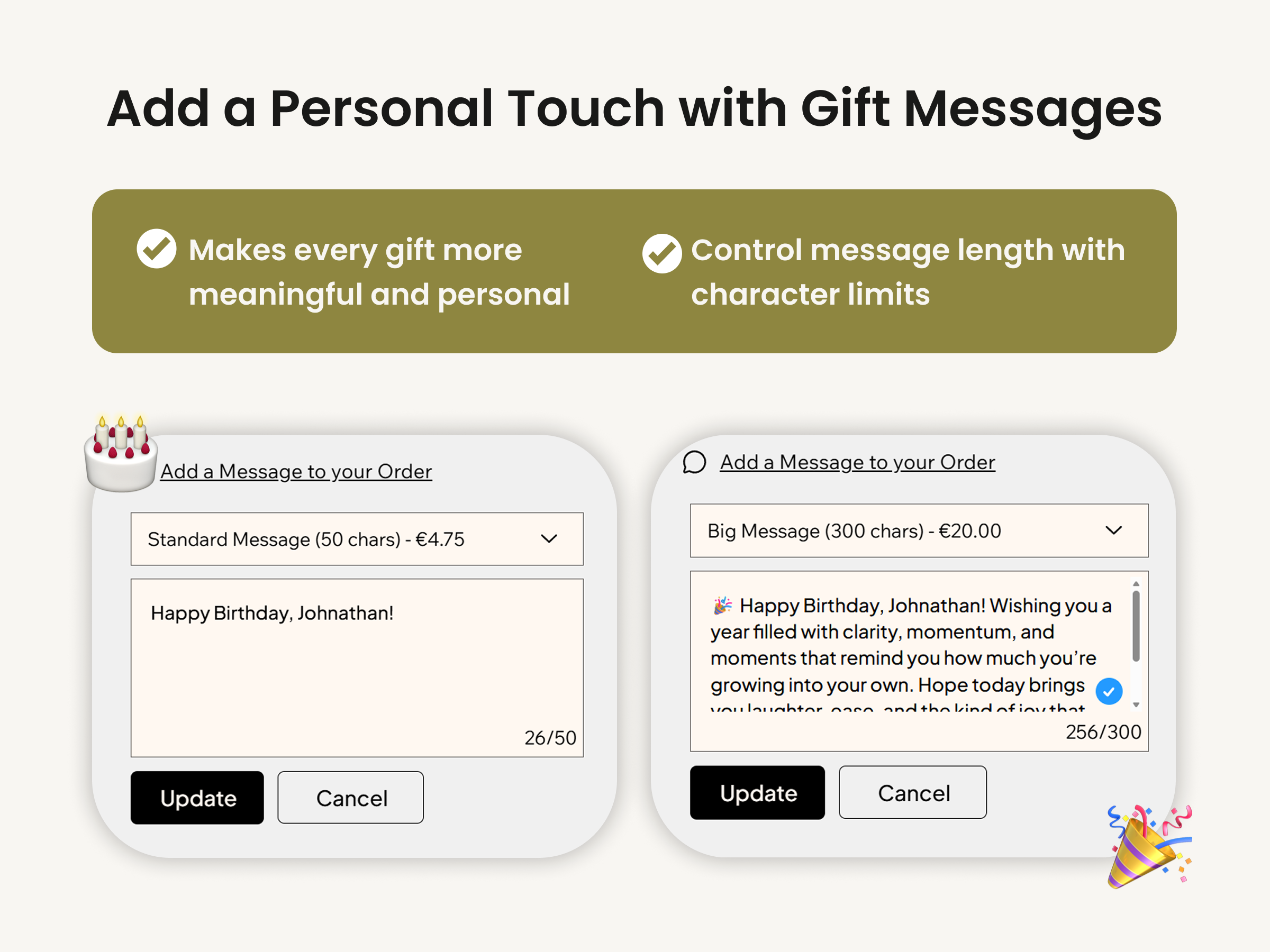 Take full control over your gifting strategy. Effortlessly create and upsell multiple gift wrap and gift message options. You decide the value: set options as free perks to reward loyalty, or charge a specific price to create a new revenue stream. Set character limits for gift messages to align with free or premium card options.