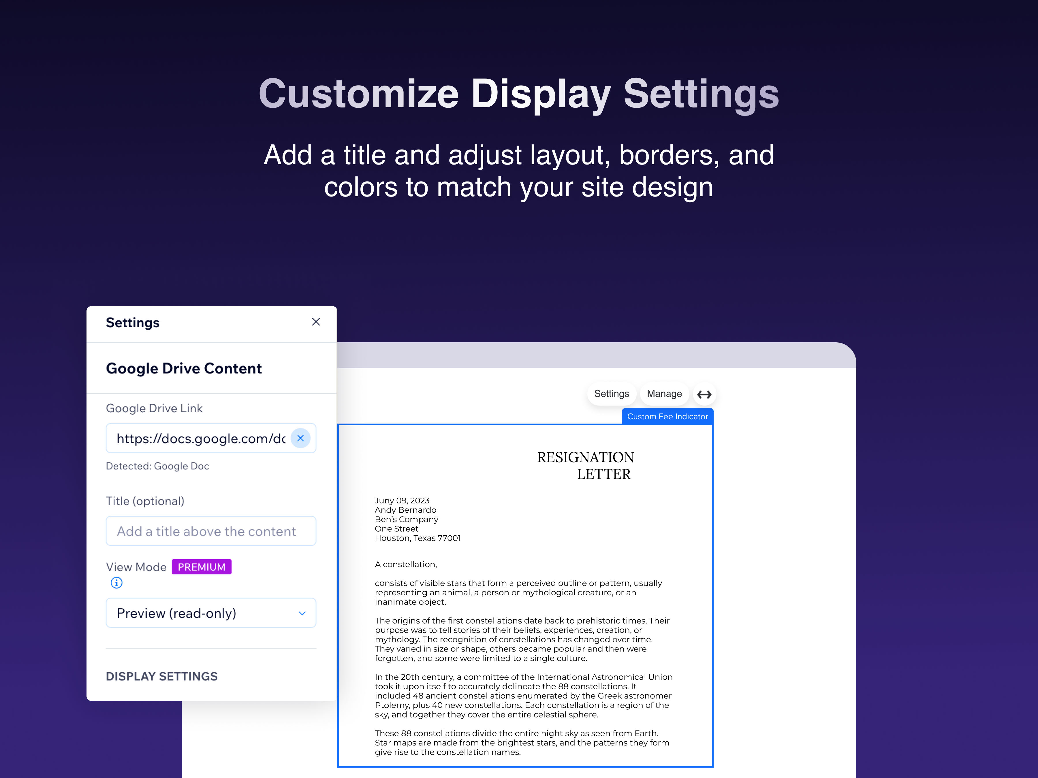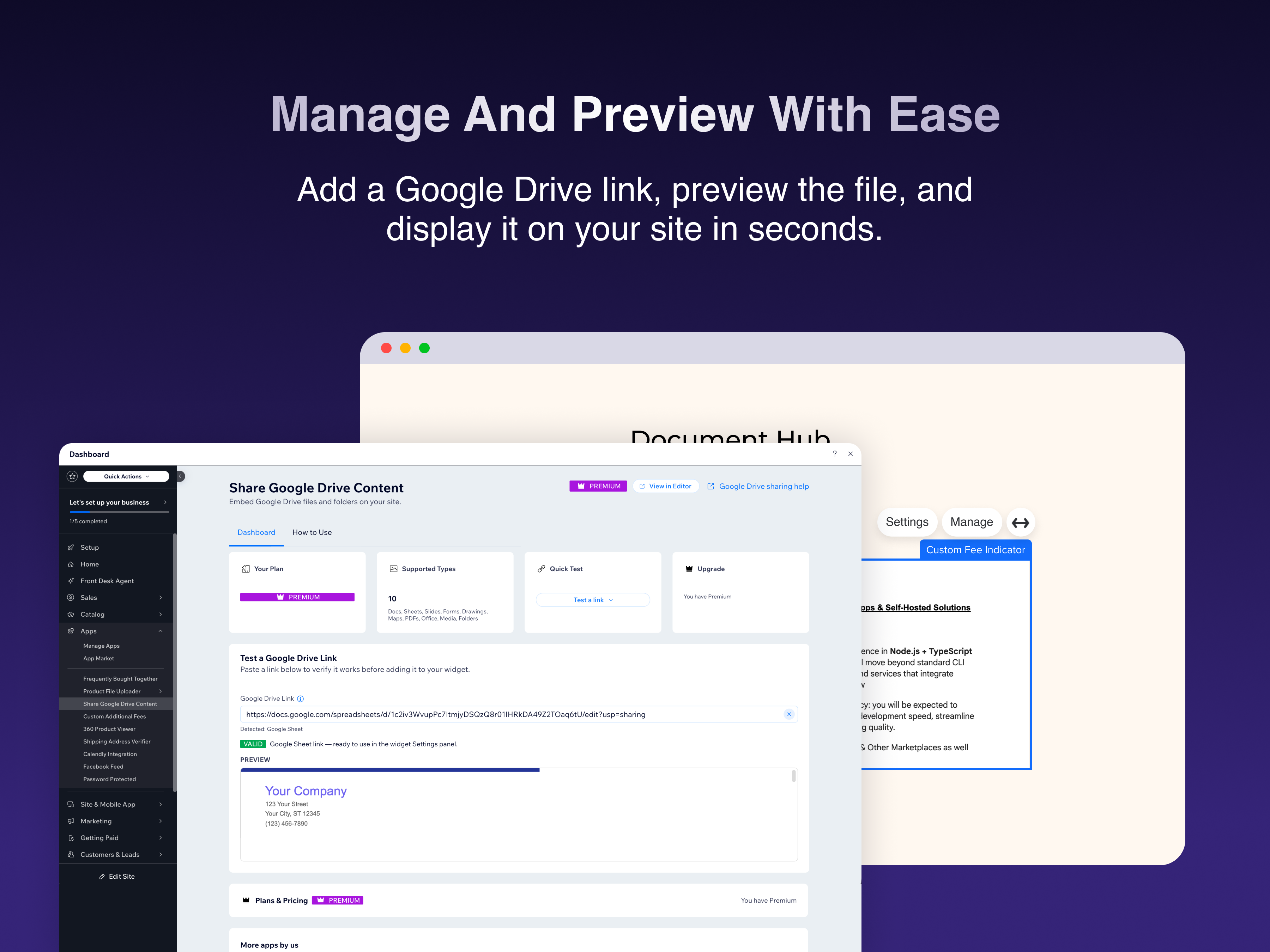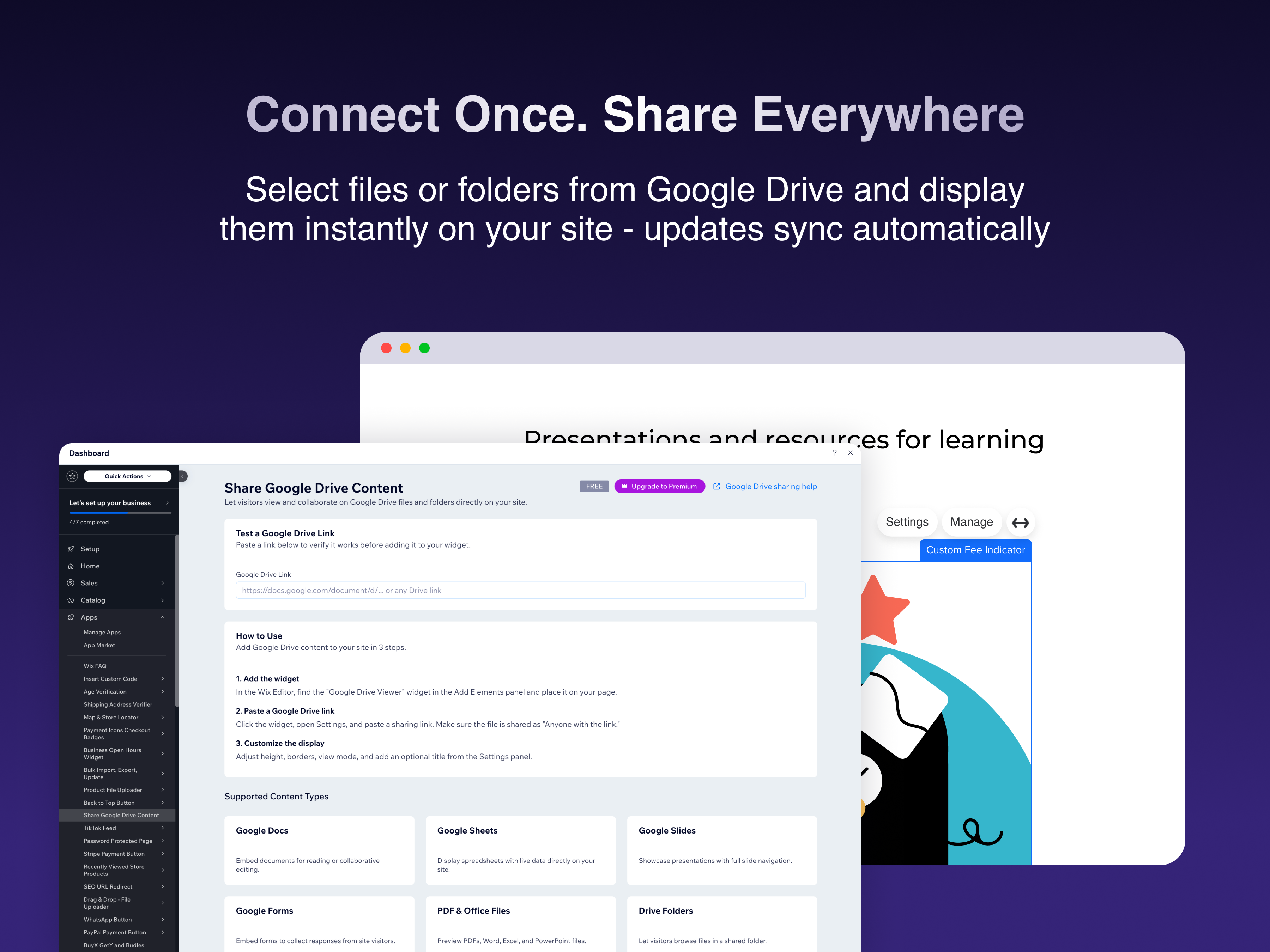 Share Google Drive Content lets your site visitors view and interact with Google Drive files and folders directly on your pages - no downloads, no redirects. Simply paste a Google Drive sharing link into the widget's settings panel, and the content is embedded instantly. Your visitors can view Google Docs, Sheets, Slides, Forms, PDFs, Microsoft Office files, and even browse shared folders - all without leaving your site. Key features: • Supports all major Google Drive formats: Docs, Sheets, Slides, Forms, PDFs, Office files, images, and videos • Share entire Drive folders so visitors can browse multiple files • Choose between Preview mode (read-only) or Edit mode (collaborative) • Customize the display height, border style, corner radius, and add a title • Works seamlessly with your site's design • Easy setup - just paste a Google Drive link, and you're done How it works: 1. Add the Google Drive Viewer widget to any page in the Editor 2. Open the widget's Settings panel and paste a Google Drive sharing link 3. Adjust the display options to match your site's style 4. Publish - your visitors can now view and collaborate on your content Perfect for businesses sharing documents