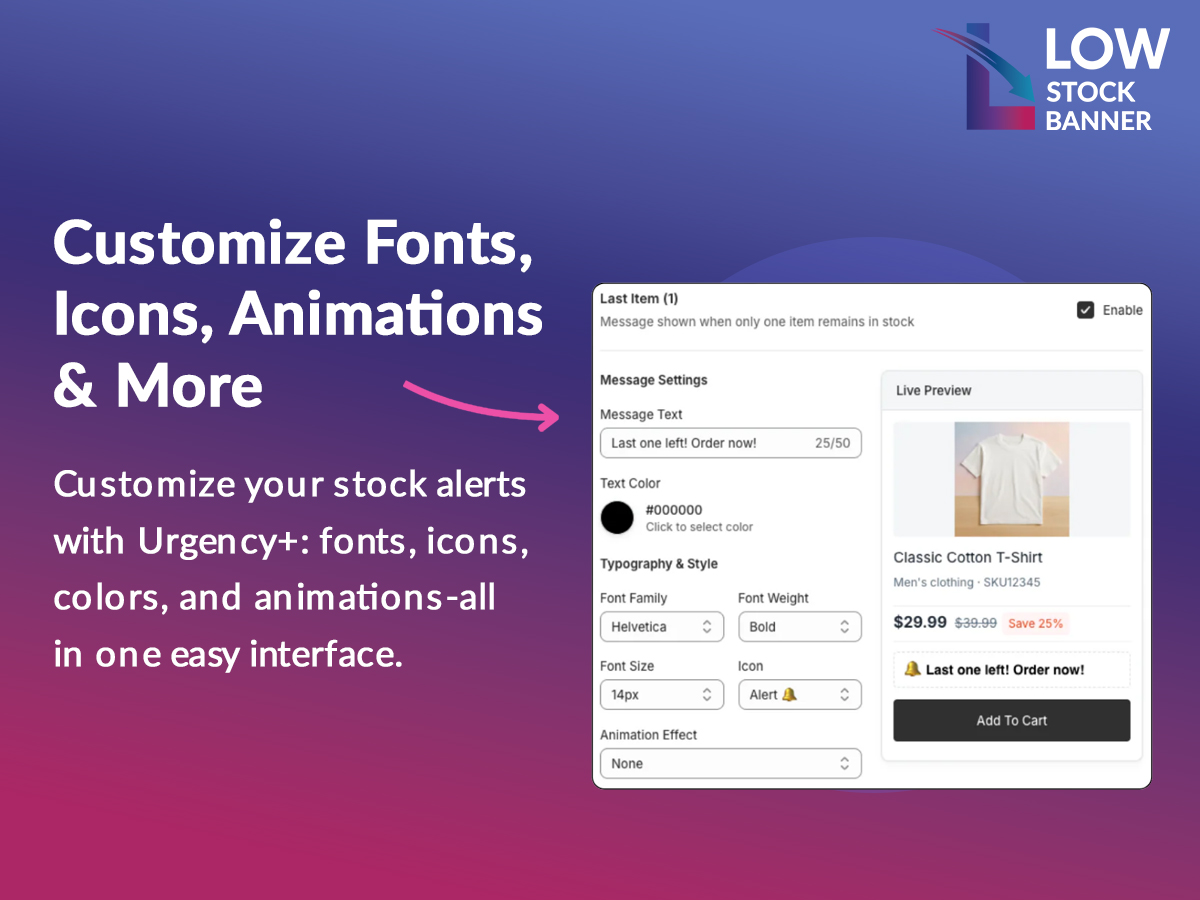 Fully Customizable Design & Animations: Tailor the appearance of your low stock alerts to seamlessly integrate with your store's branding. Choose from a range of animation options and utilize convenient holiday presets to prepare for peak shopping periods